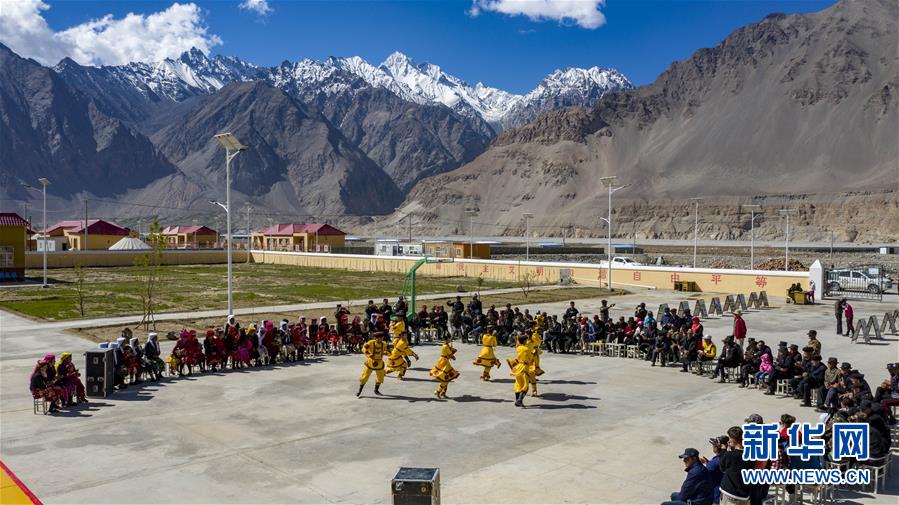 新疆塔什庫(kù)爾干塔吉克自治縣文工團(tuán)演員在熱斯喀木村為村民演出(6月6日攝,無(wú)人機(jī)照片)。