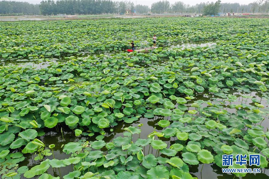 6月9日,在宿遷市宿城區(qū)中揚(yáng)鎮(zhèn)一家淺水藕套養(yǎng)小龍蝦合作社,負(fù)責(zé)人王乃國(guó)(右)在取蝦苗(無人機(jī)照片)。新華社記者季春鵬攝