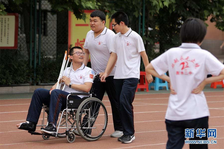 6月9日,河北省衡水市第二中學(xué)的高三學(xué)生推著一名腳部受傷的同學(xué)在操場上聊天散步。2020年高考臨近,河北省衡水市第二中學(xué)組織開展多種形式的集體“減壓”活動,幫助高三學(xué)生在緊張備考之余釋放身心壓力,以輕松、樂觀、自信的心態(tài)迎接高考。新華社記者朱旭東攝