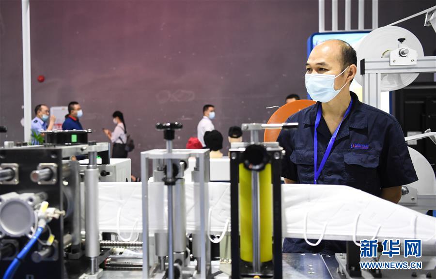 6月10日,參展工作人員站在一臺(tái)KN95口罩生產(chǎn)設(shè)備旁。當(dāng)日,廣州國(guó)際防疫物資展覽會(huì)在保利世貿(mào)博覽館舉行。本次展會(huì)面積共計(jì)3.6萬(wàn)平方米,設(shè)有防疫產(chǎn)品、設(shè)備、綜合服務(wù)、原輔料等4個(gè)展區(qū),參展企業(yè)約600家。新華社記者鄧華攝