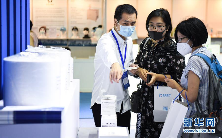 6月10日,一名參展商(左)向采購商講解口罩生產(chǎn)原料及工藝。當(dāng)日,廣州國際防疫物資展覽會在保利世貿(mào)博覽館舉行。本次展會面積共計(jì)3.6萬平方米,設(shè)有防疫產(chǎn)品、設(shè)備、綜合服務(wù)、原輔料等4個(gè)展區(qū),參展企業(yè)約600家。新華社記者鄧華攝