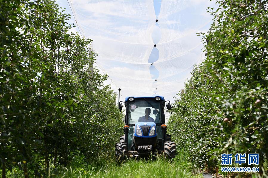 6月11日,農(nóng)民在貴州省威寧縣一處蘋果基地里駕駛農(nóng)機管護果園。近日,貴州省威寧彝族回族苗族自治縣的農(nóng)民搶抓農(nóng)時,對蘋果園進行疏果、除草等田間管理,呈現(xiàn)出一派夏管農(nóng)忙景象。威寧縣蘋果種植面積50余萬畝,蘋果產(chǎn)業(yè)已逐步成為當?shù)剞r(nóng)民增收致富的主導產(chǎn)業(yè)之一。新華社記者楊文斌攝。