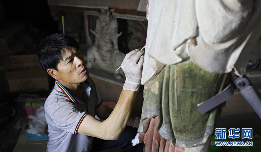 6月8日,工作人員對奉國寺的彩繪泥塑進行保護修復。新華社記者 姚劍鋒 攝