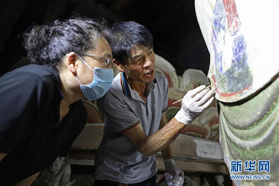 6月8日,工作人員對(duì)奉國寺的彩繪泥塑進(jìn)行保護(hù)修復(fù)。新華社記者 姚劍鋒 攝