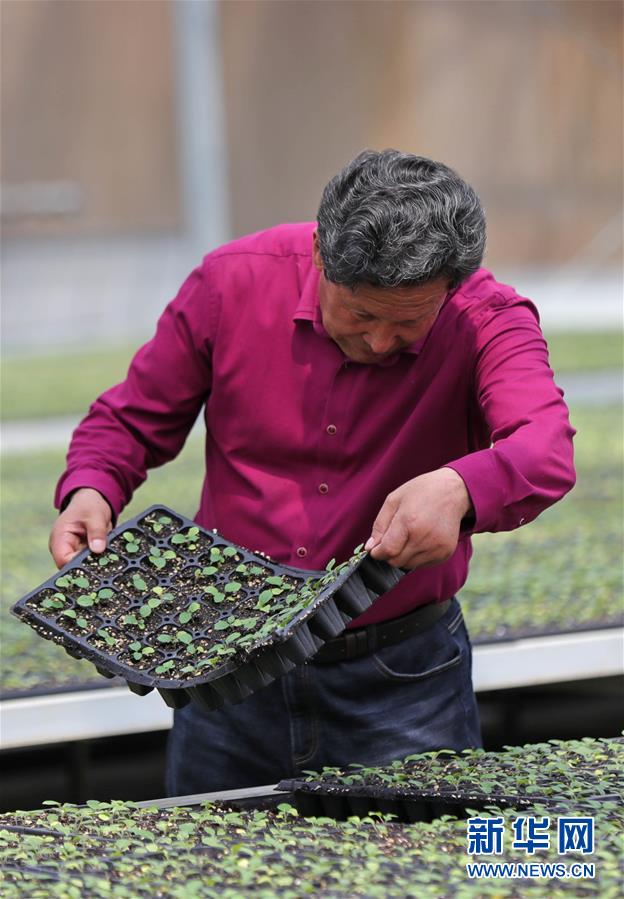 在遼寧省盤(pán)錦市大洼區(qū)新興鎮(zhèn)坨子里村,劉廣會(huì)在自己經(jīng)營(yíng)的育苗企業(yè)內(nèi)查看蔬菜種苗生長(zhǎng)情況(6月9日攝)。新華社記者 楊青 攝