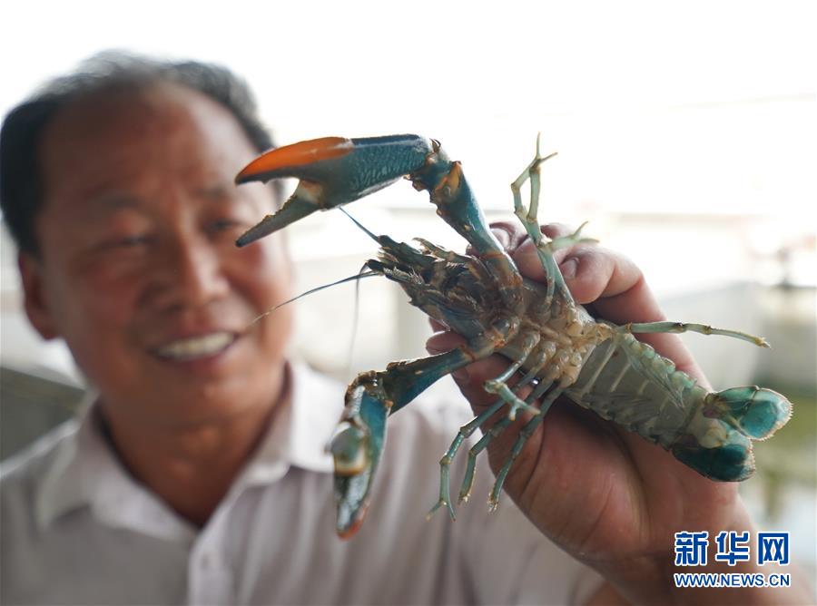 6月16日,在盧龍縣印莊鄉(xiāng)榆林甸村永新水產(chǎn)養(yǎng)殖專業(yè)合作社的養(yǎng)殖基地,養(yǎng)殖戶劉玉永在展示一只澳洲淡水龍蝦。新華社記者 楊世堯 攝