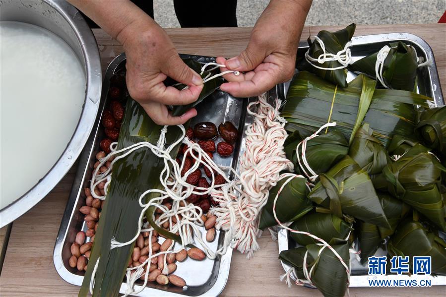 6月17日,水清溝街道居民在社區(qū)廣場上包粽子。新華社記者 李紫恒 攝
