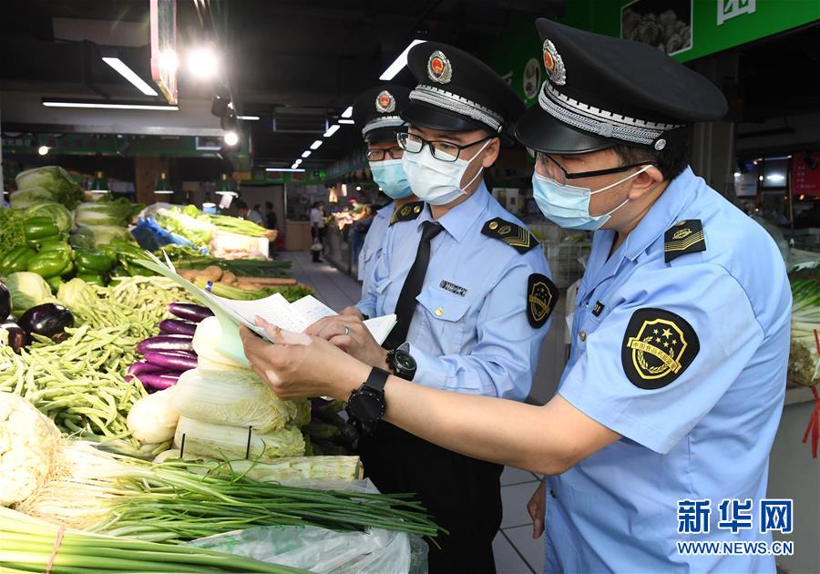 6月17日,在位于北京市海淀區(qū)的增光鴻運(yùn)市場,執(zhí)法人員對商戶所售蔬菜的進(jìn)貨渠道進(jìn)行檢查。新華社記者 任超 攝