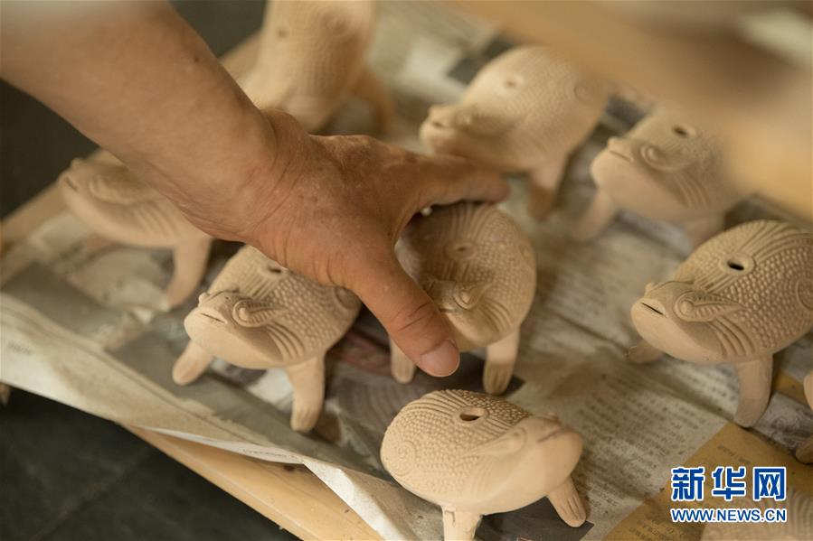 6月17日,在位于浙江慈溪的工作室,聞長慶查看一件素燒后的蟾蜍硯滴。新華社記者 翁忻旸 攝
