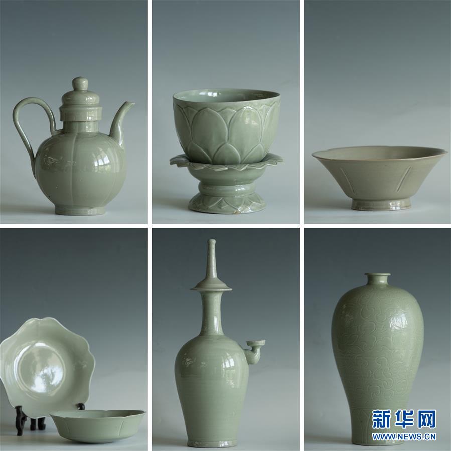 聞氏父子燒制的秘色瓷器皿(拼版照片,6月17日攝)。新華社記者 翁忻旸 攝