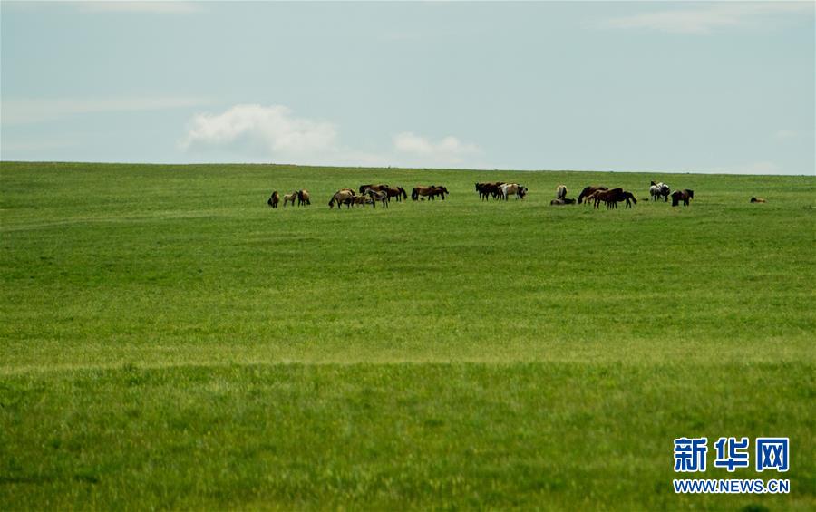 6月17日,馬兒在錫林郭勒盟烏拉蓋草原上吃草。初夏時(shí)節(jié),內(nèi)蒙古中部的錫林郭勒大草原風(fēng)景如畫。新華社記者連振攝