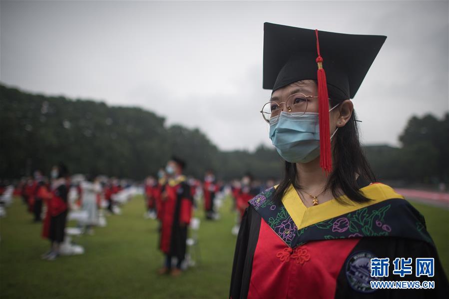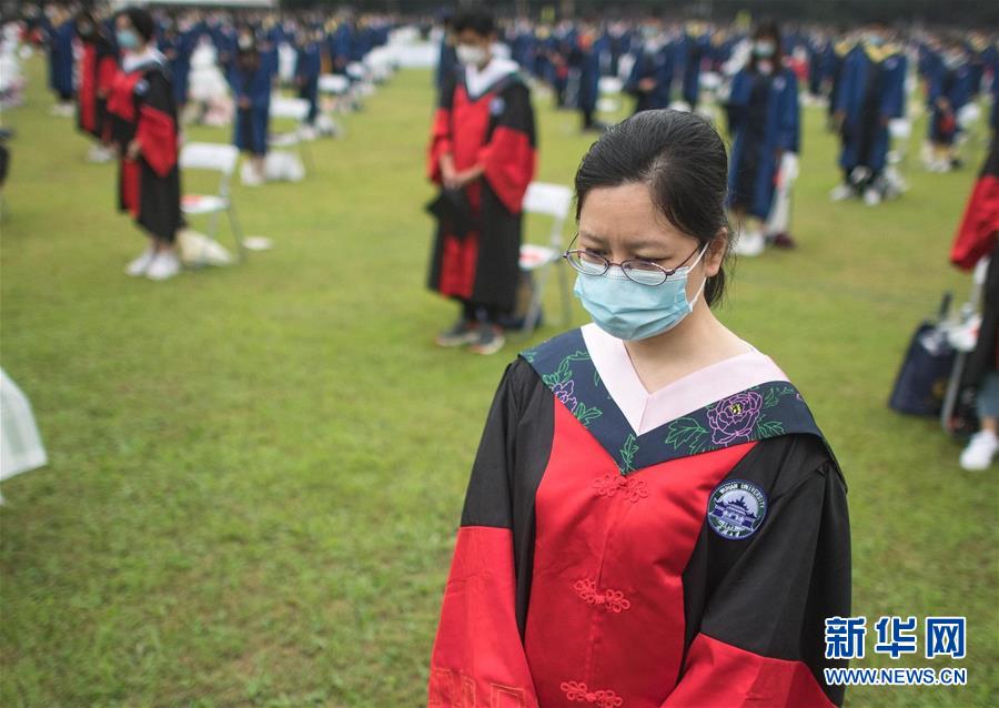 6月20日,在畢業(yè)典禮上,師生共同向新冠肺炎疫情犧牲烈士和逝世同胞默哀。新華社記者 肖藝九 攝