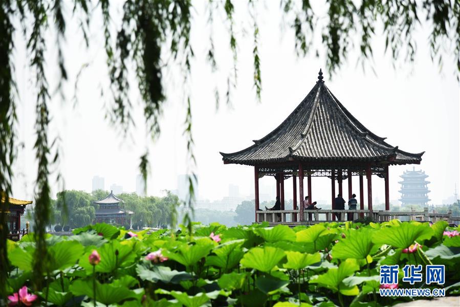 6月19日,市民在大明湖畔欣賞荷花。近日,山東濟(jì)南大明湖的荷花陸續(xù)綻放,吸引游客前來觀賞。新華社記者 王凱 攝