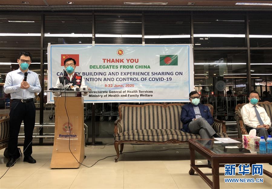 6月22日,中國赴孟加拉國抗疫醫(yī)療專家組領(lǐng)隊李文秀(左二)在孟加拉國首都達(dá)卡舉行的送行儀式上致辭。中國赴孟加拉國抗疫醫(yī)療專家組圓滿完成任務(wù),于22日乘機(jī)返回祖國。孟加拉國衛(wèi)生和家庭福利部部長馬利克對疫情發(fā)生以來中國給予孟加拉國的大力支持表示感謝。新華社記者劉春濤攝