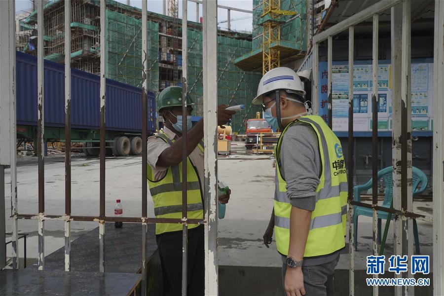 6月21日,在斯里蘭卡首都科倫坡,一名工人在中國(guó)港灣科倫坡房建項(xiàng)目工地門口接受體溫檢測(cè)。新華社記者唐璐攝