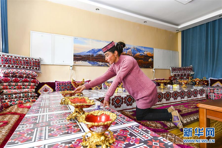 新疆塔什庫爾干塔吉克自治縣塔什庫爾干鄉(xiāng)瓦爾希迭村村民瑪依努爾古麗·依克木在民宿內(nèi)擺放物品,準備招待游客(6月4日攝)。新華社記者胡虎虎攝