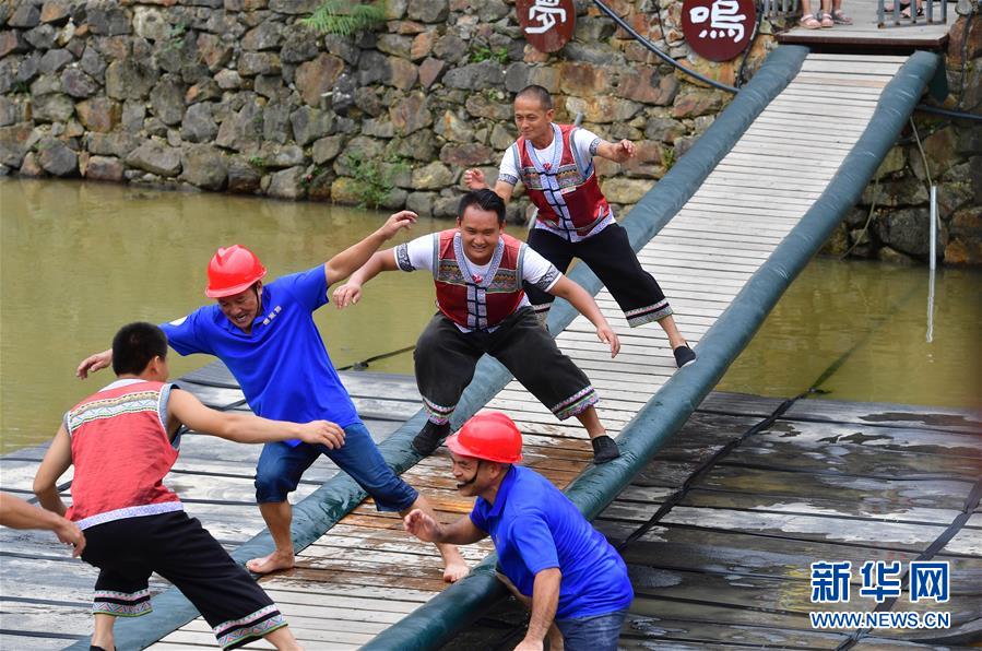 在廣西融水雙龍溝森林旅游度假區(qū)夢(mèng)嗚苗寨,幾位搬遷戶協(xié)助游客挑戰(zhàn)“搖擺橋”(6月21日攝)。近年來(lái),融水打造原生態(tài)苗族文化體驗(yàn)園——夢(mèng)嗚苗寨,讓搬遷進(jìn)城的貧困戶住進(jìn)復(fù)原建設(shè)的老房子。景區(qū)提供綠化保潔、游樂(lè)設(shè)施管理、民族歌舞表演等工作崗位,多渠道增加貧困戶收入。