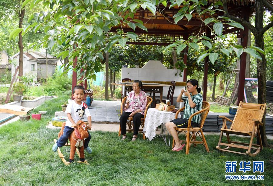 安徽省肥西縣上派鎮(zhèn)大墻村村民孫麗燕(右)和家人在自家小院里休息(6月2日攝)。新華社記者劉軍喜攝