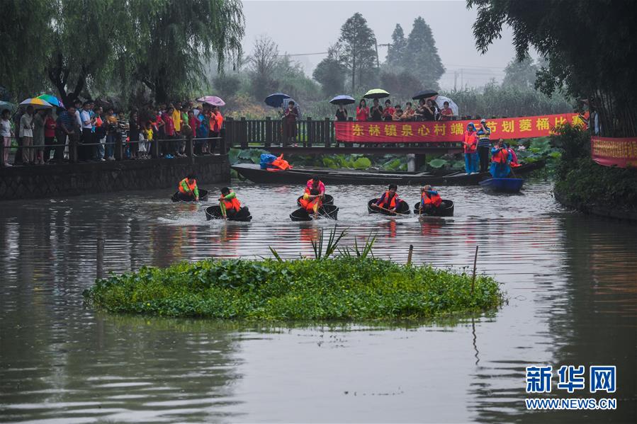6月23日,東林鎮(zhèn)村民在泉心村荷花池參加端午劃菱桶趣味活動。當(dāng)日,浙江省湖州市東林鎮(zhèn)在泉心村荷花池舉辦“慶端午劃菱桶”趣味活動。村民們劃著菱桶在水面上你追我趕,同時采收荷花和蓮蓬,呈現(xiàn)出水鄉(xiāng)特有的端午節(jié)日氛圍。在河網(wǎng)密布的東林鎮(zhèn),菱桶是水鄉(xiāng)家家戶戶都有的一種傳統(tǒng)水上勞動工具,村民在捕魚、采菱、采荷時都要用到。新華社記者徐昱攝