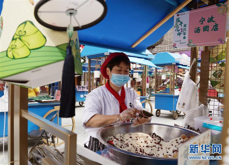6月24日,在上海豫園舉辦的端午花神國風廟會上,老字號寧波湯團店的師傅在包制傳統(tǒng)的“枕頭粽”。端午節(jié)臨近,各地舉行包粽子、做香包、賽龍舟等豐富多彩的民俗文化活動,迎接傳統(tǒng)佳節(jié)的到來。新華社記者劉穎攝
