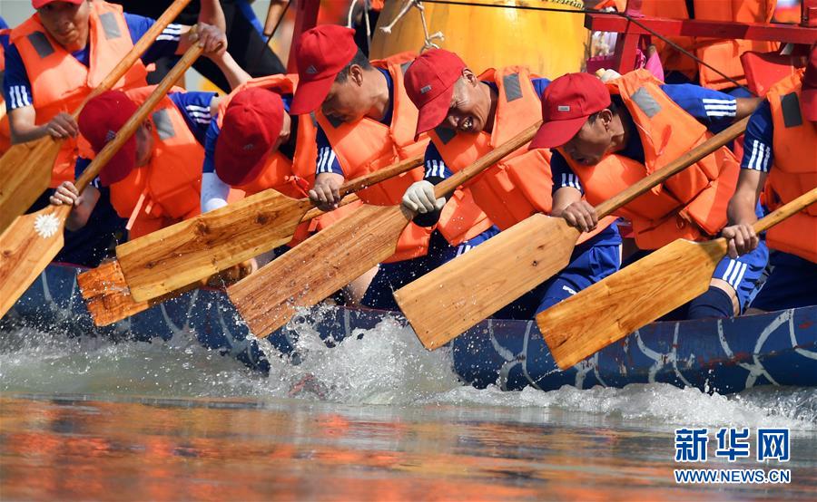 6月25日,參賽龍舟隊在比賽中。當日是農(nóng)歷五月初五,是中國民間的傳統(tǒng)節(jié)日端午節(jié)。陜西省安康市第20屆龍舟節(jié)在漢江上舉行。每年端陽節(jié)前后,安康沿江一帶的縣區(qū)都舉行龍舟賽,賽龍舟成為民間自發(fā)的盛大活動。新華社記者 陶明 攝