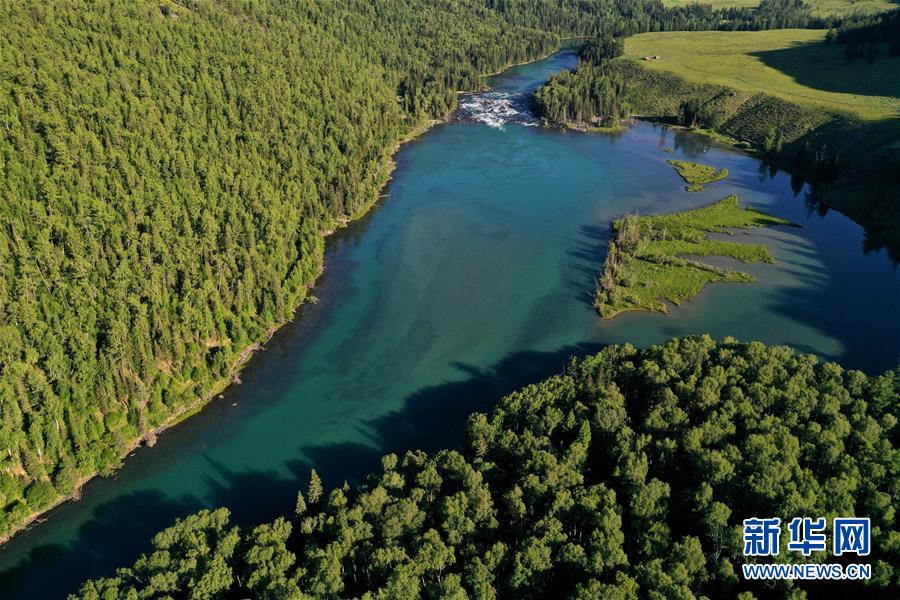 這是6月25日拍攝的新疆喀納斯景區(qū)風(fēng)光(無人機(jī)照片)。新華社記者 沙達(dá)提 攝