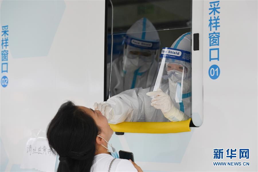 6月28日,在北京市西城區(qū)北京展覽館南側(cè)的露天廣場核酸檢測采樣點,核酸檢測采樣車內(nèi)的醫(yī)護人員為前來做檢測的人員進行采樣。新華社記者鞠煥宗攝
