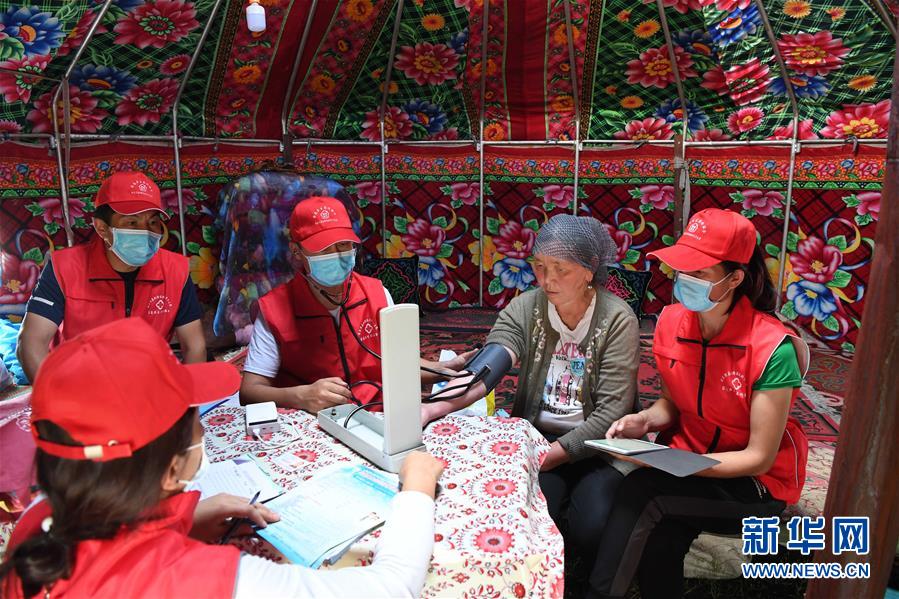 新疆布爾津縣也格孜托別鄉(xiāng)衛(wèi)生院全科醫(yī)生哈納提別克·沙旦(右三)給牧民巴合提古麗·塔拉甫汗檢查身體。新華社記者沙達(dá)提攝