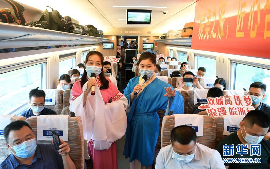 6月28日,合肥客運段工作人員在合肥南至杭州東的G9394次列車上為旅客表演節(jié)目。新華社記者劉軍喜攝