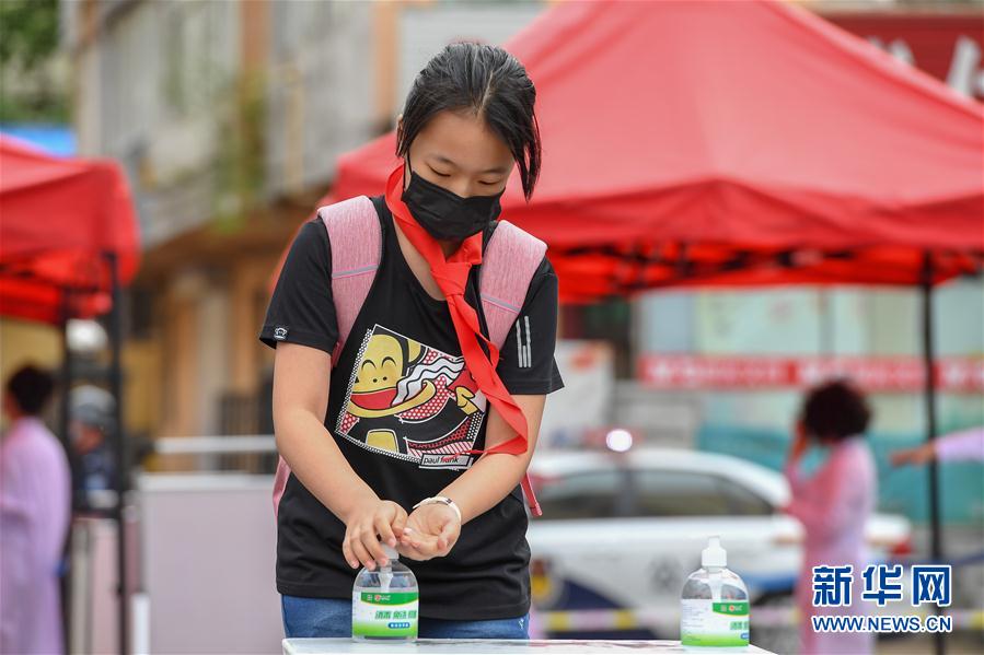 6月29日,在吉林市第一實驗小學,學生進行手部消毒。新華社記者張楠攝