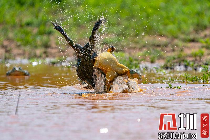 2020年6月30日?qǐng)?bào)道(具體拍攝時(shí)間不詳),南非波羅克瓦克,兩只雄性非洲牛蛙為了爭(zhēng)奪雌性牛蛙,在池塘中打架,這樣的情形十分罕見。畫面中,戰(zhàn)況十分激烈,一只非洲牛蛙在另外一只試圖逃到池塘邊緣時(shí)撕咬對(duì)手,甚至將另外一只拋向空中。這些精彩的照片是由南非開普敦?cái)z影師Temujin Johnson拍攝的。