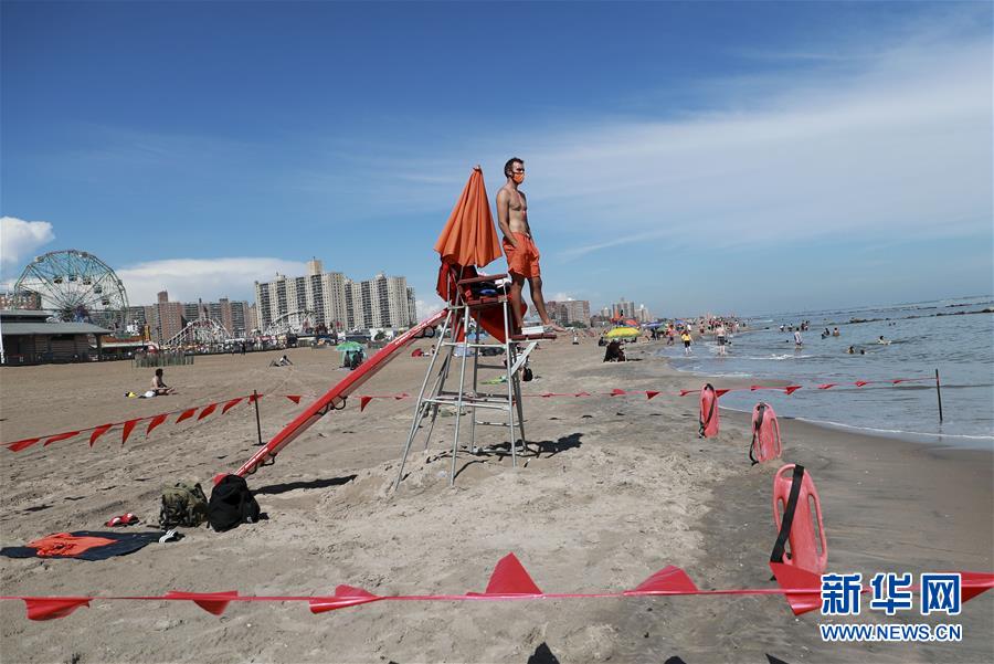 7月1日,救生員在美國紐約科尼島的一處海灘查看海面情況。當(dāng)日,美國紐約市屬八處海灘正式重新準(zhǔn)許民眾游泳,救生員也同時(shí)上崗。新華社記者王迎攝