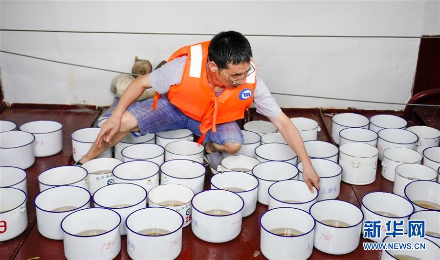 7月2日,長江清溪場水文站站長朱輝在水文作業(yè)船上清點長江水樣。新華社記者劉潺攝
