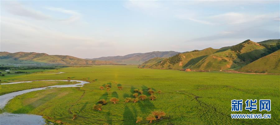 烏蘭毛都草原景色(7月1日無人機照片)。盛夏時節(jié),內(nèi)蒙古興安盟科爾沁右翼前旗的烏蘭毛都草原綠意盎然,風景醉人。烏蘭毛都草原地處大興安嶺南麓,屬丘陵山地草原,風光獨特。新華社記者徐欽攝