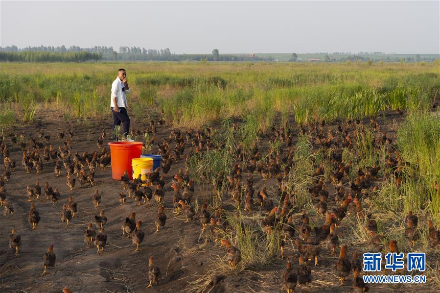 7月1日,在黑龍江省五大連池市的草原上,桑慶軍吹響口哨召喚他的“雞部隊(duì)”。新華社記者謝劍飛攝