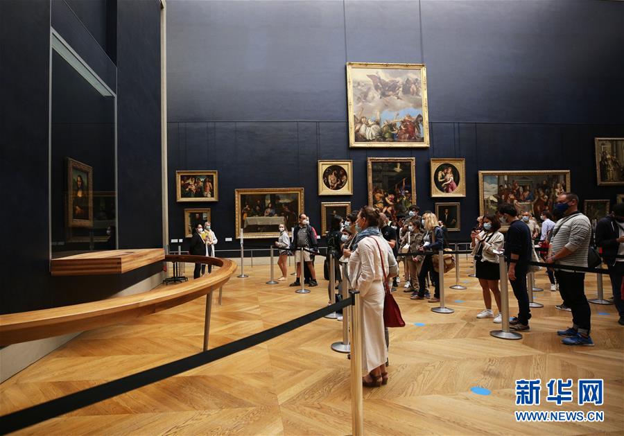 7月6日,參觀者在法國巴黎盧浮宮博物館欣賞萊昂納多·達·芬奇的名作《蒙娜麗莎》。因新冠病毒疫情關(guān)閉3個多月后,法國盧浮宮博物館于6日重新開放。新華社記者高靜攝