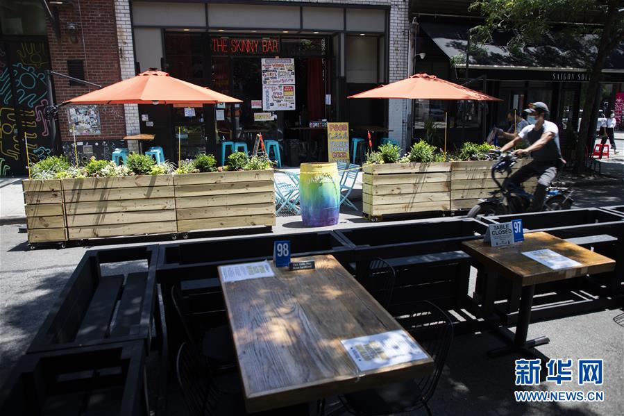 7月6日,一名男子騎車從美國(guó)紐約一家餐廳的戶外餐區(qū)旁經(jīng)過。當(dāng)天,紐約進(jìn)入重啟第三階段,美甲店、按摩店等個(gè)人護(hù)理業(yè)在經(jīng)歷近4個(gè)月的停業(yè)后被允許重新開放。因防疫需要,原本應(yīng)在第三階段開放的餐飲業(yè)室內(nèi)就餐仍處于暫停狀態(tài)。新華社記者王迎攝