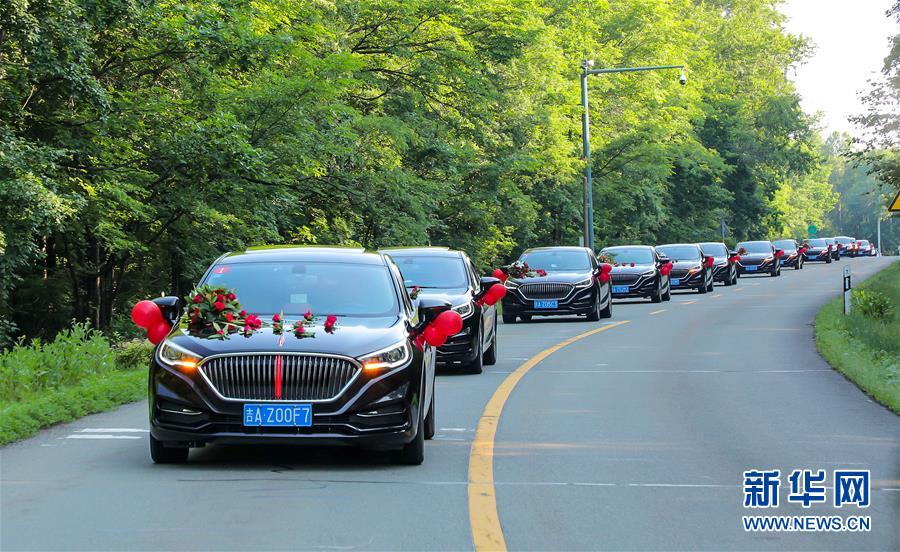 7月8日,載有新人的車輛前往長(zhǎng)白山北景區(qū)婚禮現(xiàn)場(chǎng)。新華社記者林宏攝