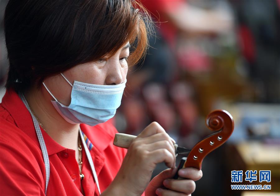 工人在河南駐馬店市確山縣提琴產(chǎn)業(yè)園提琴生產(chǎn)車間檢查提琴質(zhì)量(6月23日攝)。新華社記者李嘉南攝