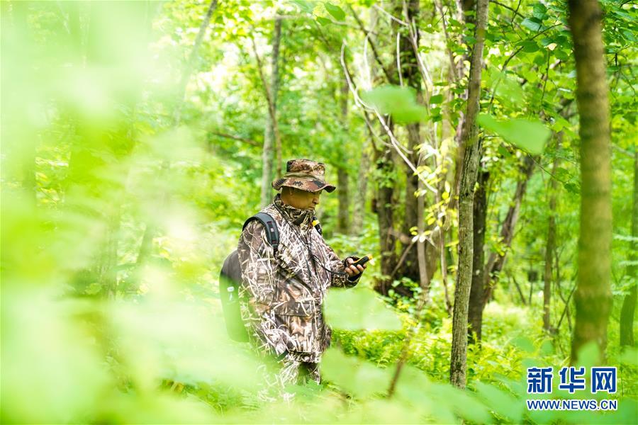 董紅雨在迎春林業(yè)局有限公司施業(yè)區(qū)內(nèi)進(jìn)行野生東北虎蹤跡信息搜集和巡護(hù)工作(7月8日攝)。新華社記者李建平攝