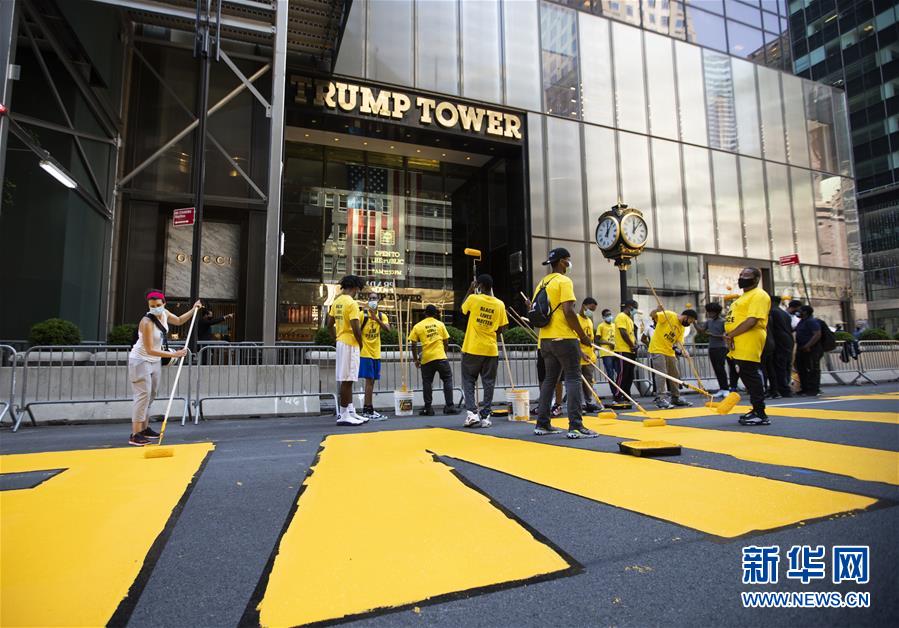 7月9日,在美國紐約第五大道特朗普大廈前,人們涂寫“黑人的命也是命”標(biāo)語。當(dāng)天,數(shù)十人在紐約第五大道特朗普大廈前的路面上涂寫“黑人的命也是命”標(biāo)語。紐約市計(jì)劃在多處地點(diǎn)涂寫“黑人的命也是命”標(biāo)語。新華社記者王迎攝