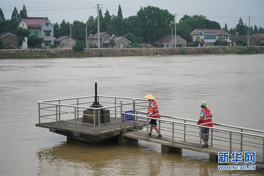 7月9日,在高淳區(qū)陽江鎮(zhèn)永豐圩,巡堤員在進(jìn)行“水牌”(巡堤查險(xiǎn)責(zé)任牌)交接。新華社記者季春鵬攝
