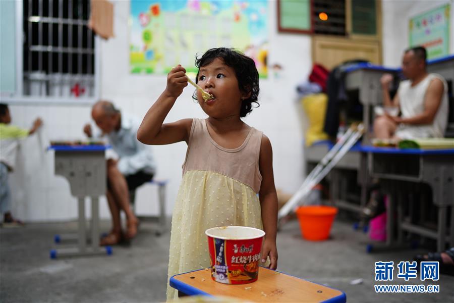 7月9日,小朋友在安置點(diǎn)里吃飯。當(dāng)日,江西鄱陽(yáng)縣鄱陽(yáng)鎮(zhèn)因洪水受災(zāi)的村民被轉(zhuǎn)移到多個(gè)集中安置點(diǎn)。在鄱陽(yáng)縣五一中心學(xué)校安置點(diǎn),志愿者和工作人員接到任務(wù)后不到十小時(shí)內(nèi),為被轉(zhuǎn)移村民布置了28間教室,供519人安頓,并為村民發(fā)放褥子、床單、枕頭、盒飯、飲用水等物資。新華社記者周密攝