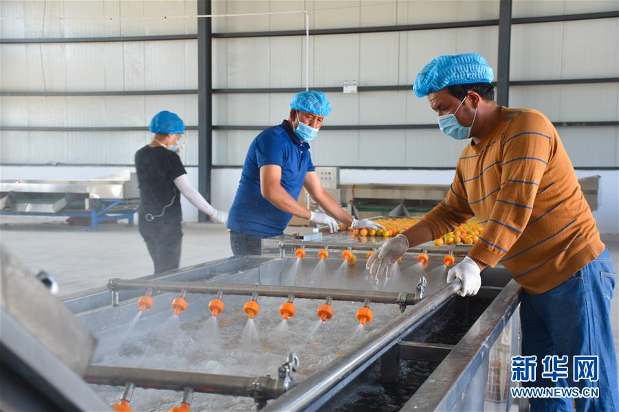 在新疆英吉沙縣一家合作社內,員工在清洗杏子(7月2日攝)。新華社記者高晗攝