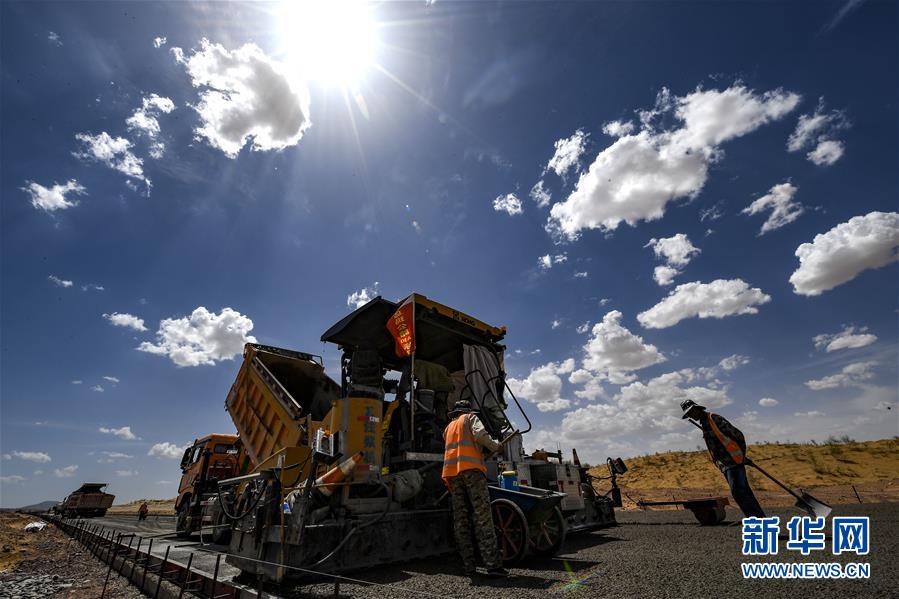 7月10日,工人在位于寧夏境內(nèi)的烏瑪高速青銅峽至中衛(wèi)段A9標(biāo)段施工。盛夏時(shí)節(jié),位于寧夏境內(nèi)的烏瑪(內(nèi)蒙古烏海市至青?,斍呖h)高速青銅峽至中衛(wèi)段正在抓緊施工建設(shè)。該路段主線全長(zhǎng)122.9公里,其中穿越騰格里沙漠腹地的18公里公路是寧夏建設(shè)的首條沙漠高速公路,預(yù)計(jì)2021年建成通車(chē)。新華社記者馮開(kāi)華攝。