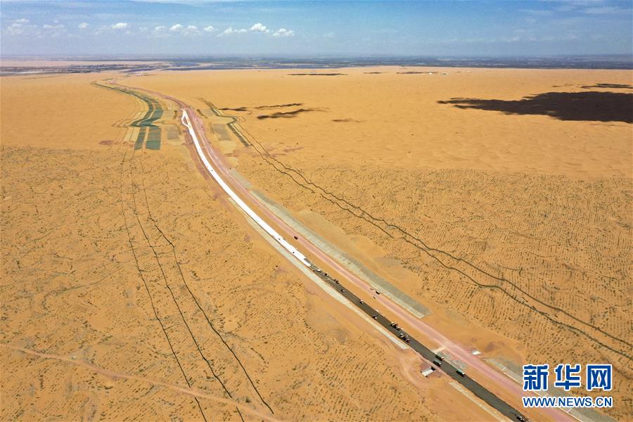 7月10日,位于寧夏境內(nèi)的烏瑪高速青銅峽至中衛(wèi)段A10標(biāo)段在施工中(無(wú)人機(jī)照片)。盛夏時(shí)節(jié),位于寧夏境內(nèi)的烏瑪(內(nèi)蒙古烏海市至青?,斍呖h)高速青銅峽至中衛(wèi)段正在抓緊施工建設(shè)。該路段主線全長(zhǎng)122.9公里,其中穿越騰格里沙漠腹地的18公里公路是寧夏建設(shè)的首條沙漠高速公路,預(yù)計(jì)2021年建成通車(chē)。新華社記者馮開(kāi)華攝。