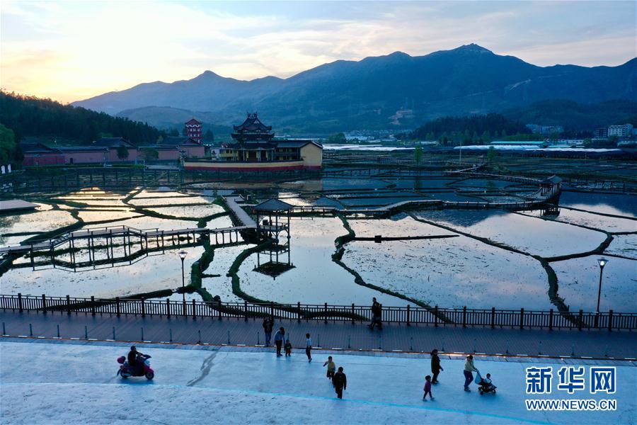 4月17日傍晚時分,人們在浦源村鯉魚溪公園散步休閑(無人機(jī)照片)。新華社記者 姜克紅 攝