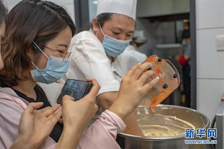 在位于新疆精河縣城的一家糕點(diǎn)店,朱虹美團(tuán)隊(duì)在錄制視頻,介紹創(chuàng)意食品——由枸杞果醬、鮮枸杞制作的“枸杞蛋糕”(7月11日攝)。新華社記者 胡虎虎 攝