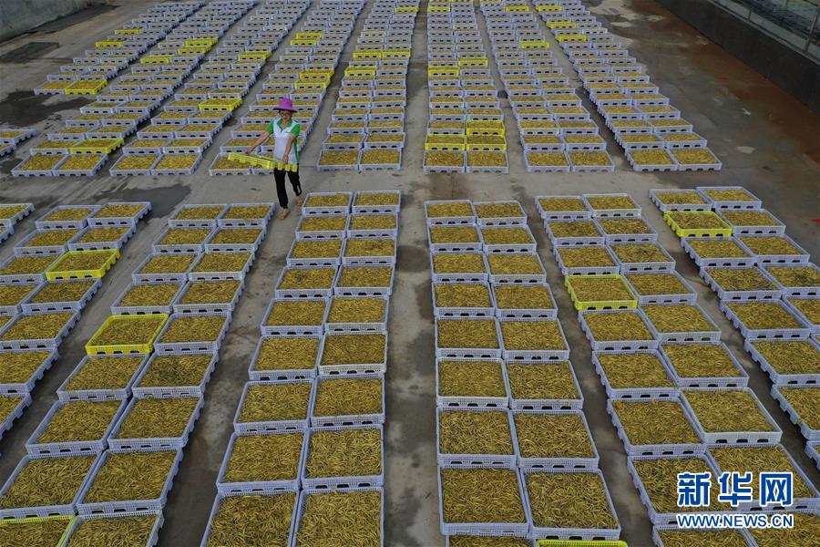 7月12日,祁東縣黃土鋪鎮(zhèn)雁隆食品公司內(nèi),工人通過傳送帶運(yùn)送黃花菜準(zhǔn)備加工(無人機(jī)照片)。新華社記者 趙眾志 攝