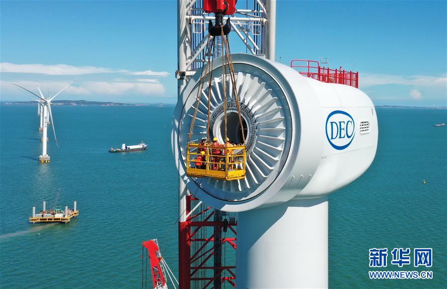 施工人員在福建福清興化灣二期海上風(fēng)電場10兆瓦海上風(fēng)電機(jī)組安裝現(xiàn)場忙碌(6月12日攝,無人機(jī)照片)。記者7月13日從三峽集團(tuán)了解到,國內(nèi)首臺(tái)10兆瓦海上風(fēng)電機(jī)組日前在三峽集團(tuán)福建福清興化灣二期海上風(fēng)電場成功并網(wǎng)發(fā)電,這是目前我國自主研發(fā)的單機(jī)容量亞太地區(qū)最大、全球第二大的海上風(fēng)電機(jī)組,刷新了我國海上風(fēng)電單機(jī)容量新紀(jì)錄。新華社記者 林善傳 攝
